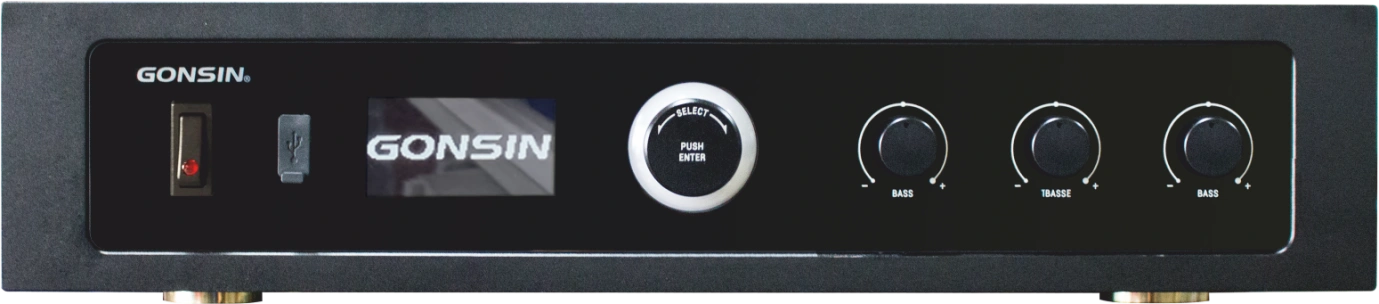 Conçu avec un panneau en verre trempé noir et bouton de navigation, écran OLED affichant l’état du système, le nombre d’orateurs, les modes de prise de parole et autres informations, avec menu multilingue.